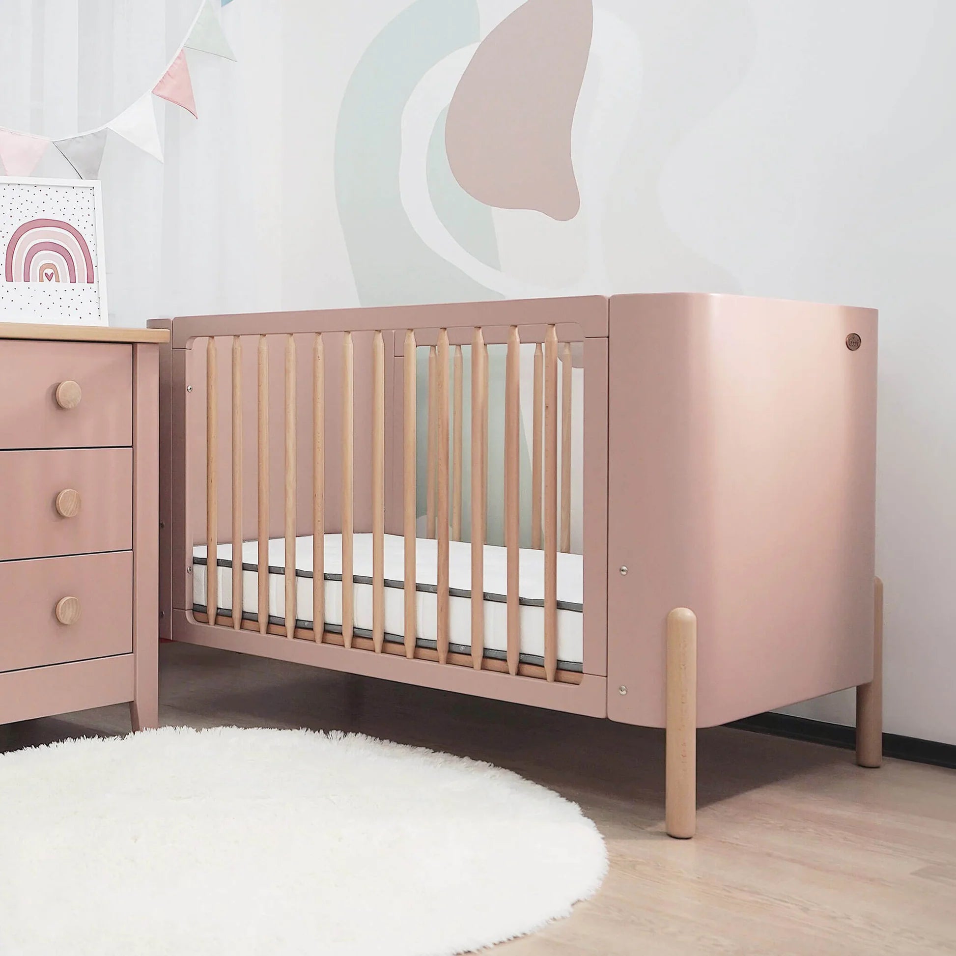 Our Nova Cot Bed has a modern design that comprises of a two tone colourway, sleek round edges and exposed spindles on both side panels.